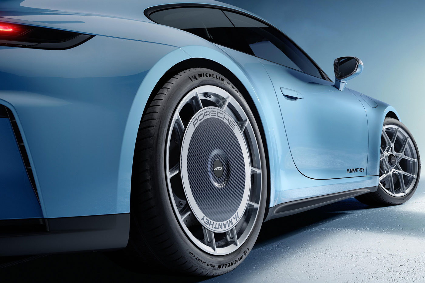 Für Kunden, die besondere optische Akzente setzen möchten, bietet Porsche weiteres sportliches Zubehör an. Dazu gehören beleuchtete Türeinstiegsblenden aus Carbon mit Manthey Schriftzug, LED-Türprojektoren mit weißem Manthey Logo oder der optionale Manthey-Schriftzug für die Türen. Auch die Carbon-Aerodiscs sind in mehreren Farben erhältlich. Für den Einsatz auf der Rennstrecke können zudem Bergelaschen in Rot, Schwarz oder Gelb montiert werden, die in entsprechende Gewinde an Front und Heck eingeschraubt werden – für den Straßenverkehr müssen sie wieder demontiert werden. Ergänzend lassen sich Front-Luftauslässe und Heck-Lufteinlässe aus CFK nachrüsten.