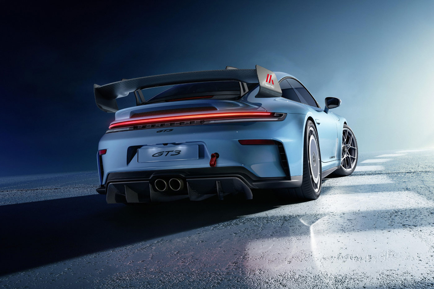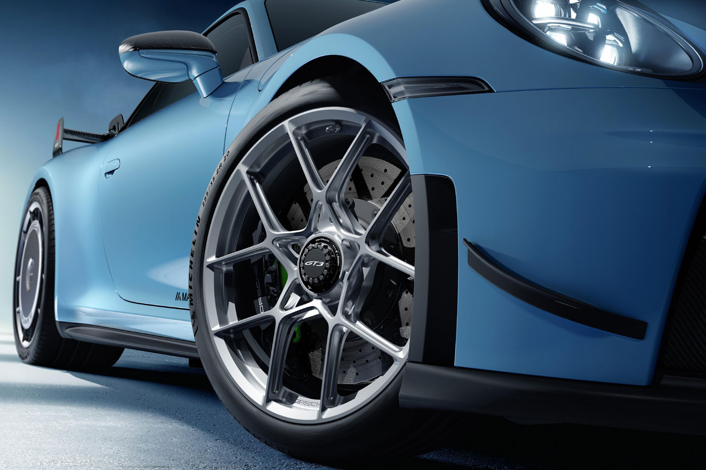 Der Schwanenhalsflügel des GT3 fällt breiter aus, erhält eine Abrisskante (Gurney) und größere, nach innen gebogene Endplatten zur verbesserten Luftführung. Auch der Heckdiffusor mit verlängerten Finnen trägt zu mehr Abtrieb bei, ohne den Luftwiderstand zu erhöhen. CfK-Aerodiscs an der Hinterachse reduzieren den Luftwiderstand und optimieren den Luftstrom als Teil des gesamten Aerodynamikkonzepts. Insgesamt steigt der Abtrieb klar an, während der Luftwiderstand unverändert bleibt: In Straßen-Konfiguration erzeugt der GT3 mit Manthey Kit bei 285 km/h 355 Kilogramm Gesamtabtrieb, in der reinen Track-Einstellung – die im öffentlichen Straßenverkehr nicht zulässig ist – sogar 540 Kilogramm.