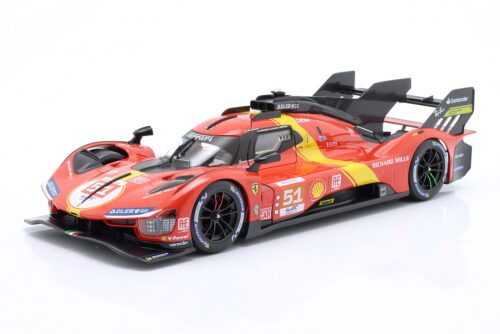 Ferrari 499P #51 Sieger 24h LeMans 2023 Pier Guidi Calado Giovinazzi Modell im Maßstab 1:18 Beim 24h-Rennen von LeMans 2023 ging das AF Corse Team mit dem Ferrari 499P an den Start. Unter der Startnummer 51 schafften es die Fahrer Alessandro Pier Guidi James Calado und Antonio Giovinazzi auf den ersten Platz des Gesamtklassements. Bei der 100. Auflage des 24h Rennens von Le Mans war es für Ferrari nach 50 Jahren Abwesenheit ein gelungenes Comeback. Hersteller: Bburago 24h-Rennen LeMans 2023 originalgetreue Cockpitnachbildung lenkbare Vorderräder zu öffnende Türen Maßstab: 1:18 Das Modell wurde in der gewohnt hochwertigen Bburago-Qualität produziert und spiegelt das Original bestmöglich wider. Ferrari 499P #51 Sieger 24h LeMans 2023 Pier Guidi Calado Giovinazzi Modell im Maßstab 1:18 vom Hersteller Bburago.