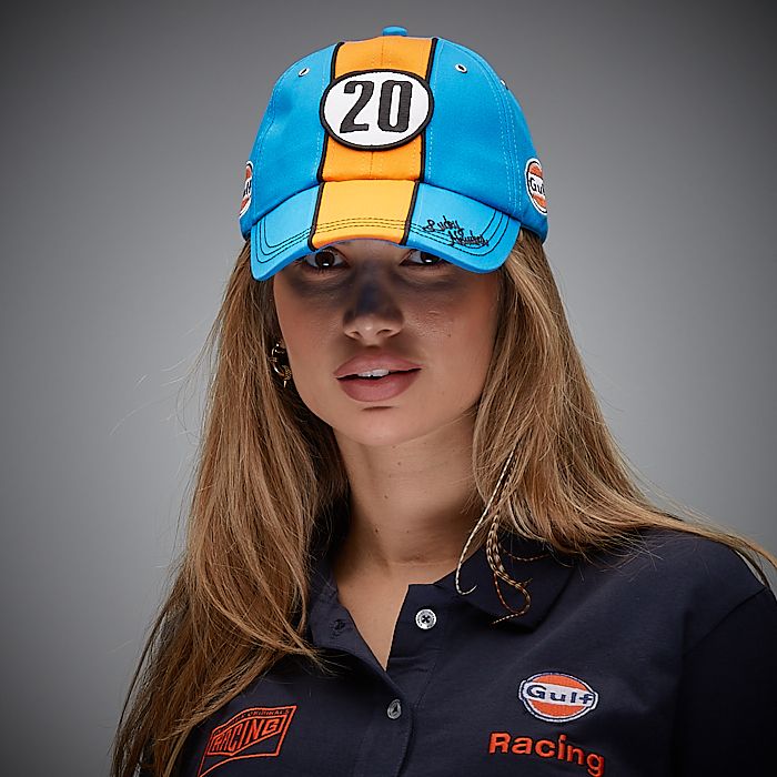 Gulf Cap 20 Lucky Number Der Topseller aus hochwertigem Canvas – Baumwollstoff. Diese Basecap von Gulf überzeugt in Form und Design! Einheitsgröße mit verstellbarem Riegel zum Anpassen an jede Kopfgröße. Die Kappe zeigt auf der Front die Startnummer 20 des Porsche 917 eine Hommage an den Film Le Mans in dem Steve McQueen in der ikonischen Rolle des Michael Delaney das Genre Rennsport neu definierte. Gulf-Kollektion 20 Lucky Number Design größenverstellbar gebogener Kappenschirm aus 100% Baumwolle gefertigt Gulf Cap 20 Lucky Number in blau mit orangenem Streifen. Aus 100% Baumwolle hergestellt größenverstellbar.