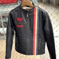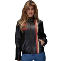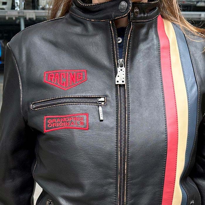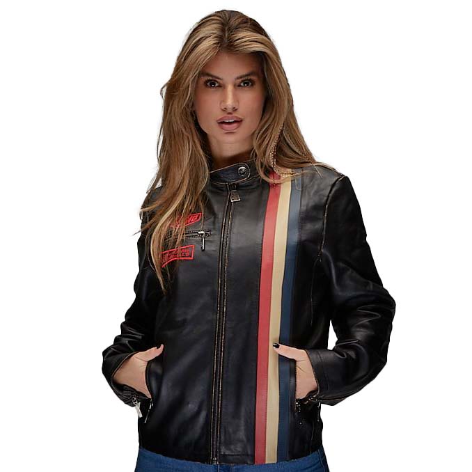 Gulf Lady Jacke Vintage Replica in schwarz Leichte Lederjacke für Damen aus Lammleder in schwarz mit dreifarbiger Lederstreifen-Applikation vom Rennsportteam Gulf. Mit Aufnähern und drei Taschen mit Reißverschlüssen. Ein Klassiker der Gulf Kollektion welcher zum 20-jährigem Jubiläum nochmals aufgelegt wurde. Washed look – dadurch fällt dieses Modell eher kleiner aus. Leichte Damen Lederjacke von Gulf aus Lammleder in schwarz. Mit abgesetzten Streifen Aufnähern und 3 Taschen mit Reißverschlüssen.