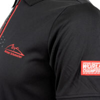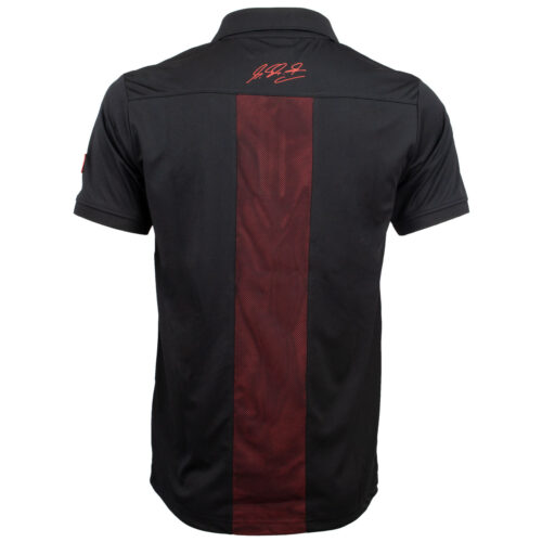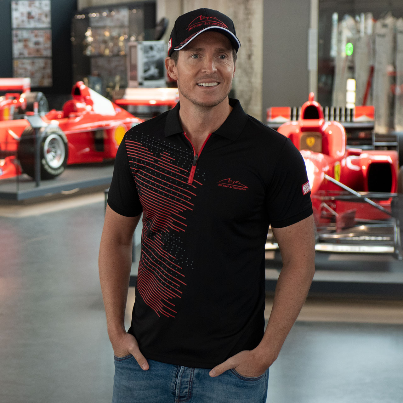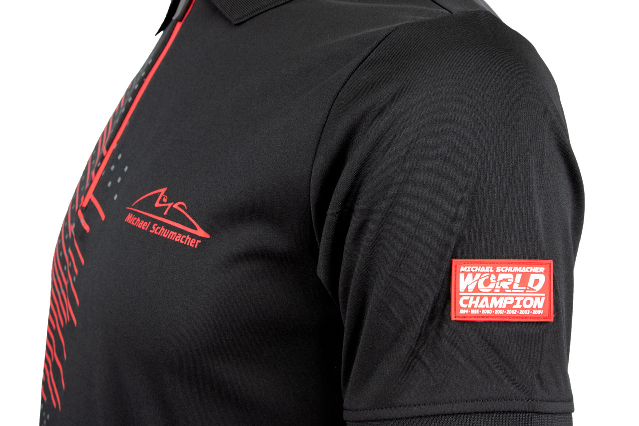 Schwarzes Michael Schumacher Polo-Shirt aus der 2018er Michael Schumacher Speedline Kollektion. Das Polo-Shirt mit schwarz-grauem Speedline Design trägt das Michael Schumacher Logo auf der Brust sowie die Unterschrift von Michael Schumacher auf der Rückseite im Nackenbereich. Auf dem Ärmel befindet sich ein Aufnäher mit dem MS Logo. Schwarzes Michael Schumacher Poloshirt mit rotem Aufdruck aus der Speedline-Kollektion. Mit Aufdruck des Logos und seiner Unterschrift im Nackenbereich.